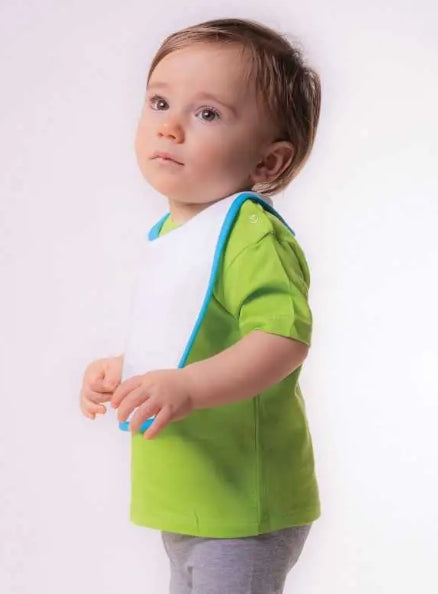 100% cotone. Bavaglio in tessuto a doppio strato con bordino di colore contrastante. Bottone automatico per la chiusura.